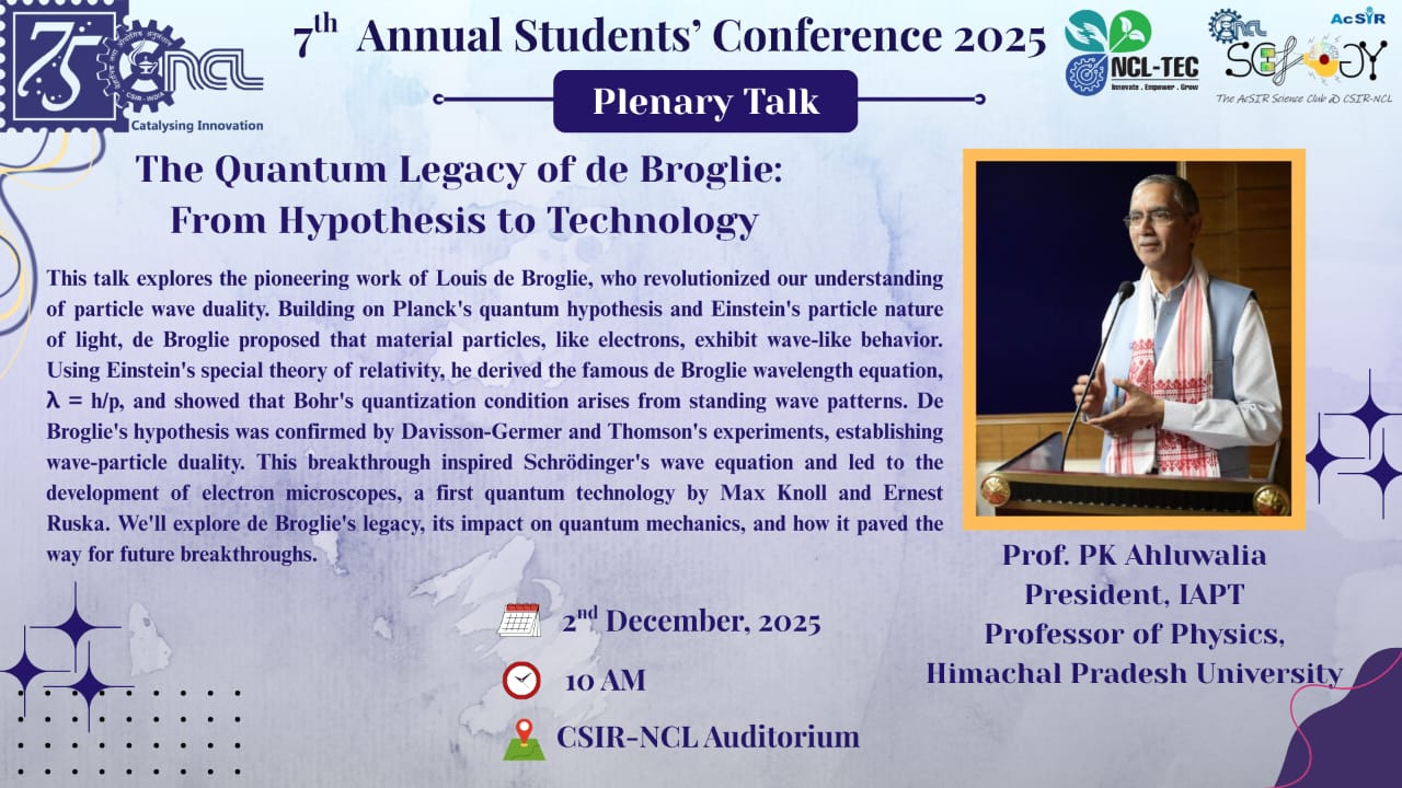 We, the students of CSIR-National Chemical Laboratory (CSIR-NCL), Pune, with the help of SciLogy- the AcSIR Science Club, NCL-TEC at CSIR-NCL, present, are organising a conference for the students titled "Annual Students' Conference". We plan to conduct this event annually, and this will be the Seventh year of the conference series, which will take place from 2ndDecember 2025 to 3rd December 2025. This conference is for the students by the students. This two-day conference offers a premier interdisciplinary platform for researchers, practitioners, and educators to present and discuss the latest innovations, trends, and concerns, as well as practical challenges encountered and solutions adopted in the fields of Chemistry and interdisciplinary studies, with an emphasis on the most recent developments.